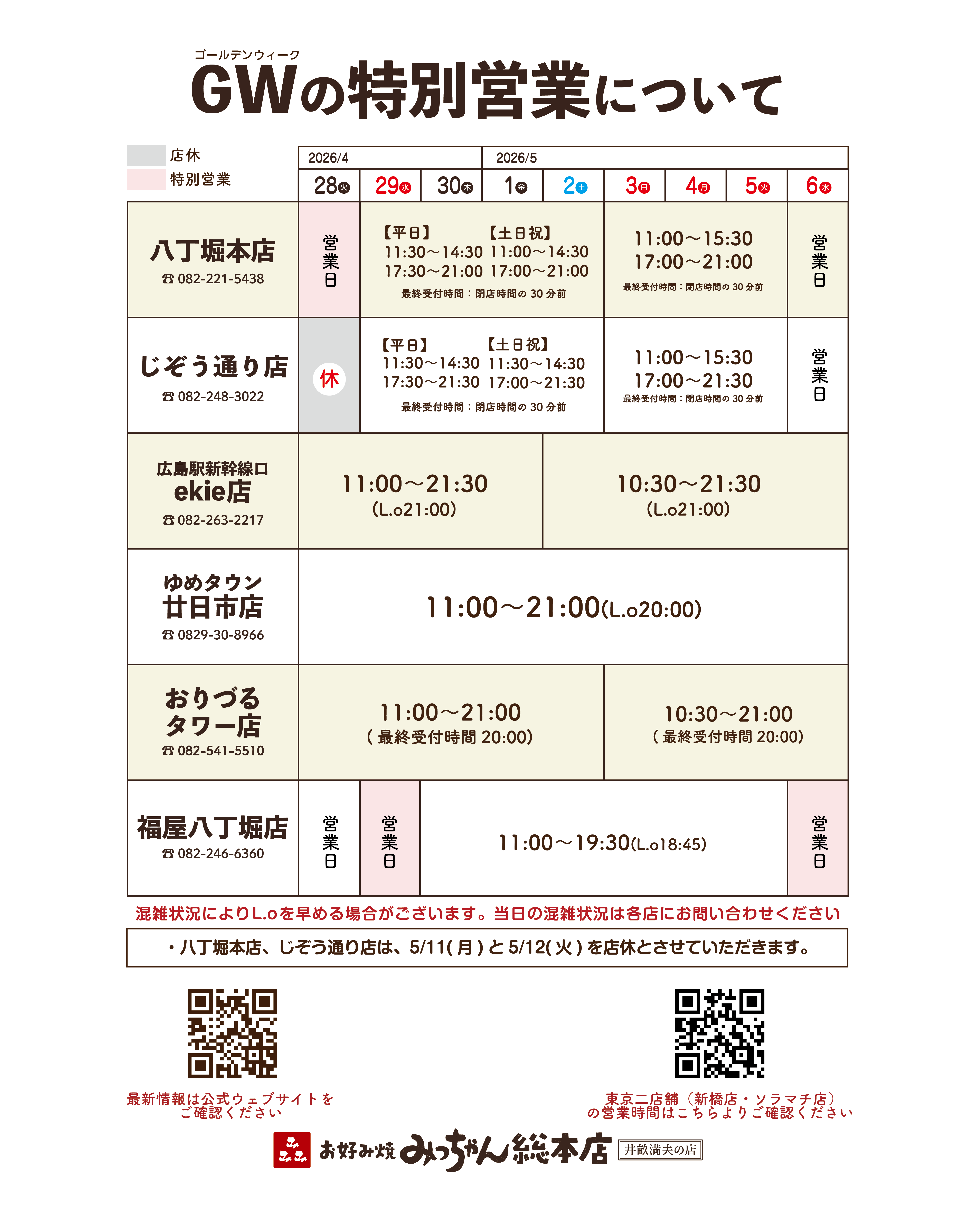 平素よりみっちゃん総本店をご愛顧いただきまして誠にありがとうございます。 GW期間の営業に関しまして、店休日の変更、及び営業時間の変更がございます。 連休期間中は仕入れの都合上、食材に限りがある場合がございます。 お客様には大変ご迷惑をおかけいたしますが、ご了承を賜れますと幸いです。 また、5/11、5/12は、八丁堀本店及びじぞう通り店を店休とさせていただきます。 皆様のご来店を心よりお待ち申し上げております。